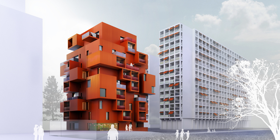 Les angles nord-ouest et sud-est assurent une transition dans ce changement de langage, en imbriquant les volumétries dans une opposition de couleur et de matière. Notre choix chromatique est une couleur intense, un orange pigmentée de rouge, cette teinte dynamique et soutenue s’affiche tel un signal à l’entrée du parc, en clin d’œil au coloris des stores de l’imposant immeuble riverain.